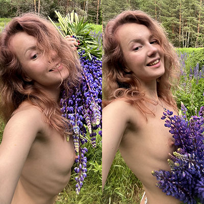 "It was the first time I shot this folio outdoors, and it was amazing. There was a field of purple lupines at the edge of my beloved forest, which inspired me to shoot. I went there in the morning, it was exciting, even though I lost an earring in the grass. I played a wooden flute, picked flowers and felt completely free naked in nature. I had fun and I hope you enjoy it too!"